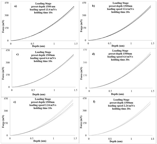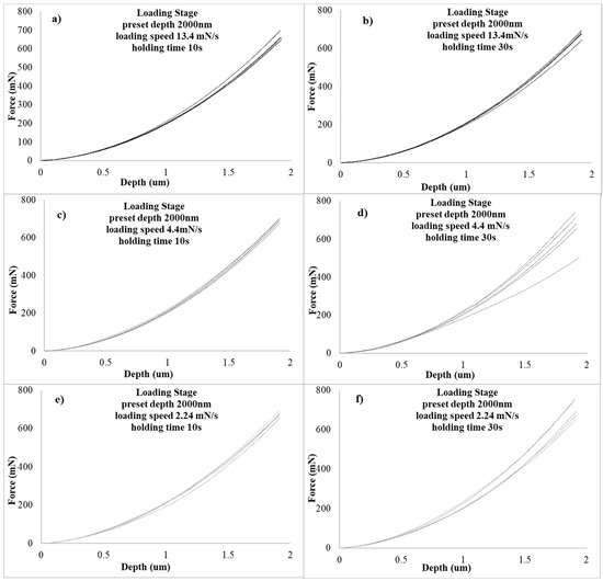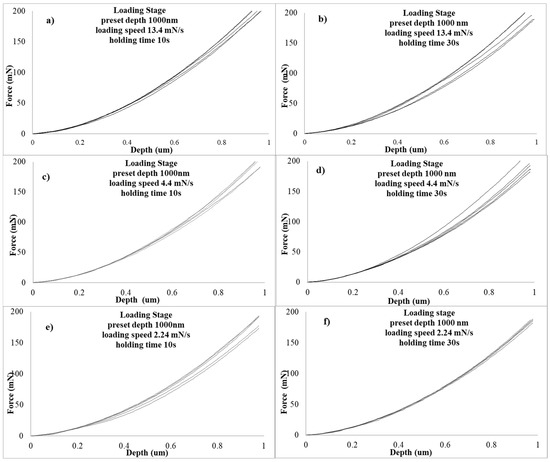 Before any attempt to assess the creep behavior of the system, it is crucial to observe the loading stage before the actual creep interval. Figure 7a–f shows the loading stage at preset depth 1000 nm for different experimental conditions (loading speed and creep holding time), Figure 8a–f shows similar results at preset depth, and Figure 9a–f presents the results for preset depth 2000 nm.