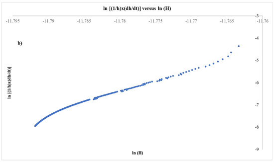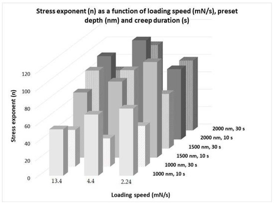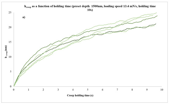 Prior to the application frame, a typical creep depth, as a function of the holding time diagram, can be seen in Figure 10a. After the application of the calculation frame on the curves of the type of Figure 10a, the diagrams as a function of can be constructed (Figure 10b), based on which the stress exponent n and the stress sensitivity factor m can be calculated. Table 3 summarizes all the crucial parameters that are the outcome of the application of the calculation frame, and which are important for analyzing the creep response of the system at the different testing parameters.