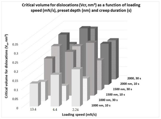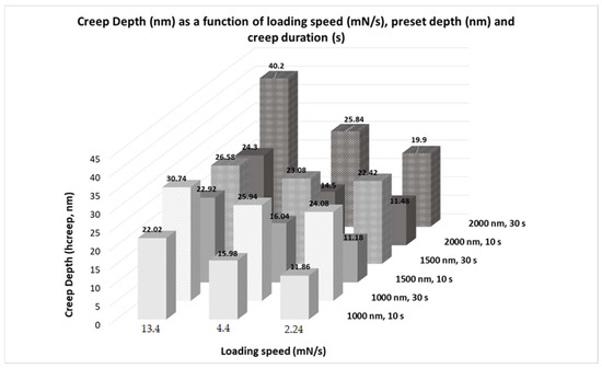 The third point to be discussed is the effect of the loading speed at the loading stage prior to the net creep stage. It can be seen from Table 3 that as the loading speed decreases, the creep deformation decreases. This behaviour is most likely (a) associated with the number of dislocations being generated at the loading stage. At low loading speeds (i.e., low strain rate), the rate of dislocation generation is reduced, a fact that has a direct impact on the number of available mobile dislocations that could accommodate the plastic deformation; (b) the expression of micro-creep phenomena prior to the net creep stage. If we recall the loading stage presented in Figure 7, Figure 8 and Figure 9, it was observed that at low preset depths and lower loading speeds, the presence of serrations was traced. Serrations indicated micro-creep phenomena at the loading stage, and this premature micro- creep drains the creep deformation that could be expressed at the net creep stage. These observations agree with other research efforts [5,6,7,8,9,10,11,22,23].