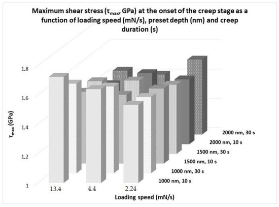 - For a more thorough assessment of creep behavior, it is important to take into consideration other parameters in addition to the net creep deformation obtained from the previous paragraphs. Maximum shear stress (τmax): τmax is the stress that practically drives the deformation process since it is the stress that makes the dislocation move and provide the plastic flow of the material. It can be seen from the data of Table 3 and Figure 12 that τmax decreases, in general, as the preset depth increases. This is expected since, according to the calculation sequence, τmax is directly related to the hardness, which, as shown and explained previously, is also reduced as the indentation depth increases. What is significant is that this trend is more profound for the lower creep periods (10 s). Additionally, it appears that τmax is also slightly affected by the loading speed, with this effect being more significant for the lower preset depths. It could be thus postulated that in general lines, τmax follows similar trends as the net creep depth but in reverse order. According to the comments of Karantzalis et al. [23], this behavior and inter-relation are expected and are exactly associated with the extent of the dislocation mobility the τmax provides.