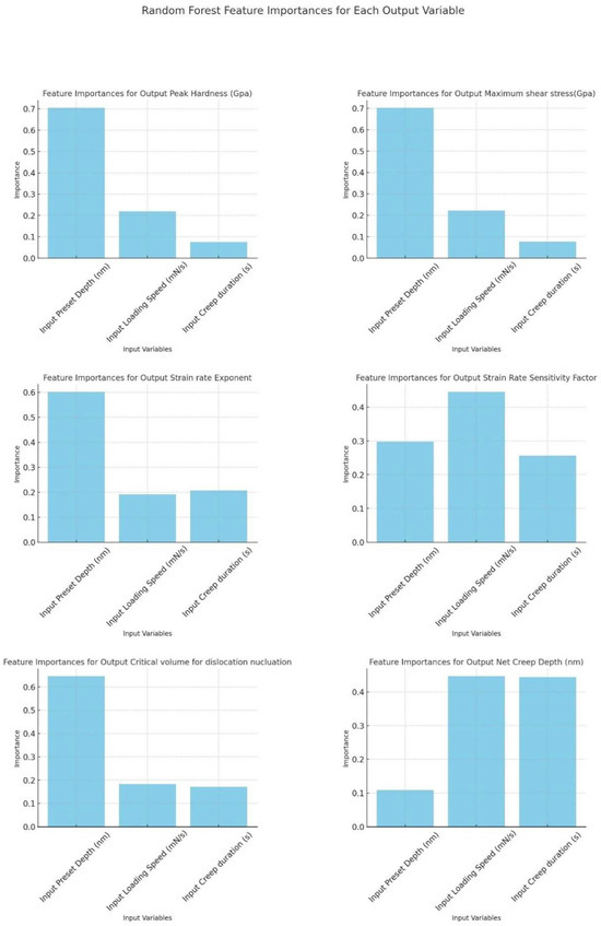 In constructing the ensemble of trees that constitute a Random Forest, each tree is generated from a sample drawn with replacement (a bootstrap sample) from the training dataset. A key aspect of this process is the consideration of a random subset of features for determining the best split at each node within a tree. The cumulative measure of a feature’s contribution to decreasing node impurity across all trees provides the basis for determining feature importance. The analysis yields several observations regarding the significance of input variables for predicting different output variables. For the output variable Peak Hardness (Gpa), the input variable Preset Depth (nm) is identified as the most crucial, with Loading Speed (mN/s) and Creep duration (s) also contributing, albeit to a lesser extent. This pattern of Preset Depth (nm) as a dominant feature is also observed in the analysis of Maximum Shear Stress (Gpa) and Strain Rate Exponent, where it stands out as the most significant input variable.