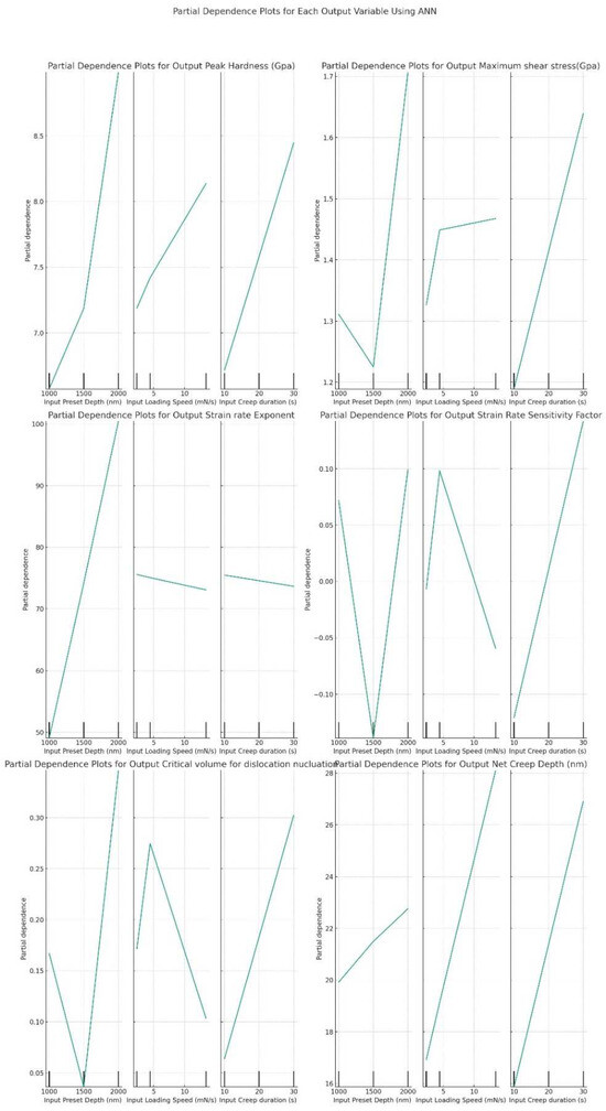 The Partial Dependence Plots (PDPs) displayed in Figure 6 visualize the impact of input features on output features within a fitted regressor model, arranged such that each row represents a different output feature, and two columns correspond to the PDPs for “Input Initial Indentation Depth (nm)” and “Input Loading Speed (mN/s)”, respectively.