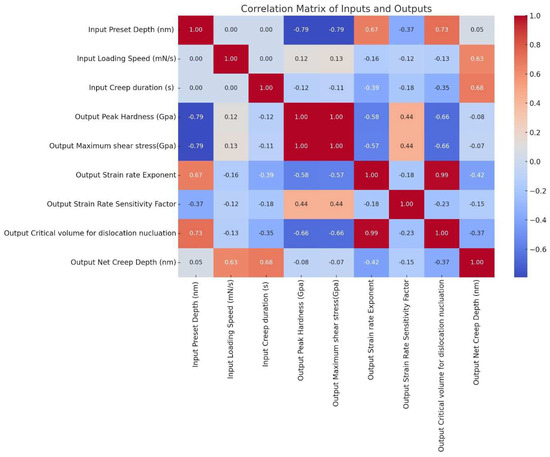 From the analysis of the correlation matrix, several key observations emerge. The Input Preset Depth (nm) shows a strong negative correlation with both “Output Peak Hardness (GPa)” and “Output Maximum Shear Stress (GPa)”, with coefficients of −0.79, suggesting that an increase in the preset depth is associated with reductions in peak hardness and maximum shear stress. The Input Loading Speed (mN/s) has a moderately positive correlation with “Output Net Creep Depth (nm)”, at a coefficient of 0.63, indicating that higher loading speeds may lead to an increase in net creep depth. Similarly, Input Creep duration (s) is strongly positively correlated with “Output Net Creep Depth (nm)” at a coefficient of 0.68, highlighting that longer durations of creep are linked to greater net creep depths.