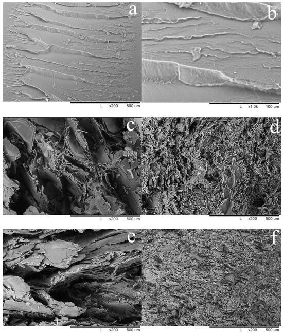 Scanning electron microscopy (SEM) images of unfilled PSU (a,b); 70 wt. % PSU + 30 wt. % NG (c); 70 wt. % PSU + 30 wt. % AG (d); 30 wt. % PSU + 70 wt. % NG (e); 30 wt. % PSU + 70 wt. % AG (f).