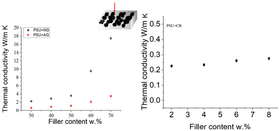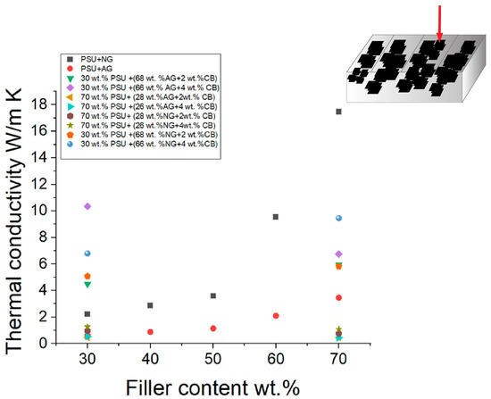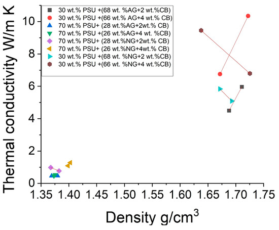 Thus, using AG as a filler, the thermal conductivity seems to increase rapidly as the filler content increases, causing the filler particles to be in close contact with one another. Figure 9 shows that the maximum thermal conductivity of the PSU-based composite was found to be of 17.47 W/m·K and 3.45 W/m·K for composites filled with 70 wt. % of NG and AG, respectively.
