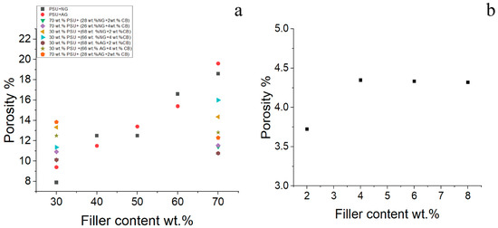 The porosity of the composite including AG and NG as fillers increased as the filler content increased as shown in Figure 8. Such increase is associated with the formation of filler agglomerates in the polymer matrix, which grow as the filler concentration increases. An uneven distribution of carbon black and graphite fillers might result in increased porosity in some places. Proper filler dispersion and homogeneous distribution can assist to improve porosity throughout the composite. We may also assume that reducing the compaction pressure during compression allows for the formation of voids or pores, increasing the total porosity of the composite.