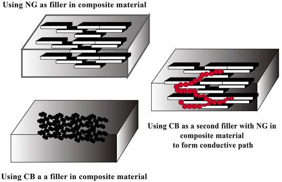 Illustration of forming efficient conductive paths using CB as a second filler with NG. Pressure at consolidation was applied perpendicular to the sample plane.