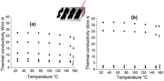 It should be noted that whereas in the previous paper [34], we reported the thermal conductivity magnitude measured along the direction of the pressure application at the samples’ consolidation, in the present study we compared the thermal conductivity measured both along the direction of the pressure application at the samples’ consolidation and in the direction normal to the pressure application direction. As is illustrated in Figure 11, flake-shape particles of NG are oriented along the sample plane, i.e., perpendicular to the pressure application direction. Comparing data presented in Figure 10 and Figure 12, one should note that the thermal conductivity of the composite containing 70 wt. % NG measured normally to the sample plane was found to be of about 17 W/m·K, whereas in the direction along sample plane the same composite exhibit thermal conductivity magnitude was about 27 W/m·K. Addition of CB enhance the difference in the conductive between various direction, composite containing 66 wt. % of NG and 4 wt. % of CB possess thermal conductivity in the direction perpendicular to sample plane of about 10 W/m·K, whereas thermal conductivity in the in-plane direction was found to be more than 37 W/m·K. Moreover, comparing the curve 5 in Figure 12a with the curves 3 and 4 in Figure 12b, it should be concluded that addition of CB to composite filled with NG increased the thermal conductivity in the in-plane direction significantly. It should be noted that such an increase was found only for highly filled composites; for composites with filler content of 30 wt. %, the addition of CB provided no positive effect, as can be seen by comparing the curve 1 in Figure 12a with the curves 1 and 2 in Figure 12b.