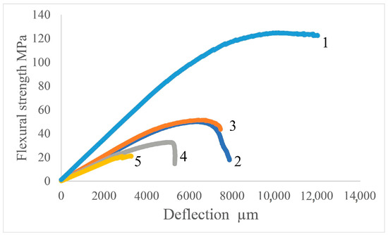 Flexural test curves of PSU-based composites with unfilled PSU solution (1); 30 (2), 70 (3), wt. % of NG; 30 (4), 70 (5) wt. % of AG.