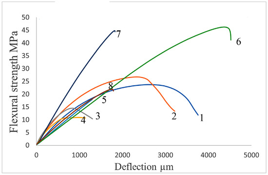 Flexural test curves of PSU-based composite filled with (1) 28 wt. % NG + 2 wt. % CB, (2) 26 wt. % NG + 4 wt. % CB, (3) 68 wt. % NG + 2 wt. % CB, (4) 66 wt. % NG + 4 wt. % CB, (5) 28 wt. % AG + 2 wt. % CB, (6) 26 wt. % AG + 4 wt. % CB, (7) 68 wt. % AG + 2 wt. % CB, (8) 66 wt. % AG + 4 wt. % CB.