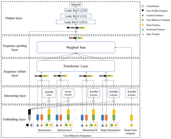 The click-through rate (CTR) prediction task is a binary classification problem that measures the likelihood of a user clicking an item. A higher CTR indicates that a higher percentage of the recommended items are clicked by the users, leading to more revenues for the advertising platforms. Therefore, research in CTR prediction has gained attention from academia and industry [1,2]. Currently, two mainstream methods exist to solve the CTR prediction task in recommender systems: feature interaction and sequential recommendation. While both methods aim to provide personalized recommendations by mining useful information from the user–item interactions, they process the feature fields differently.