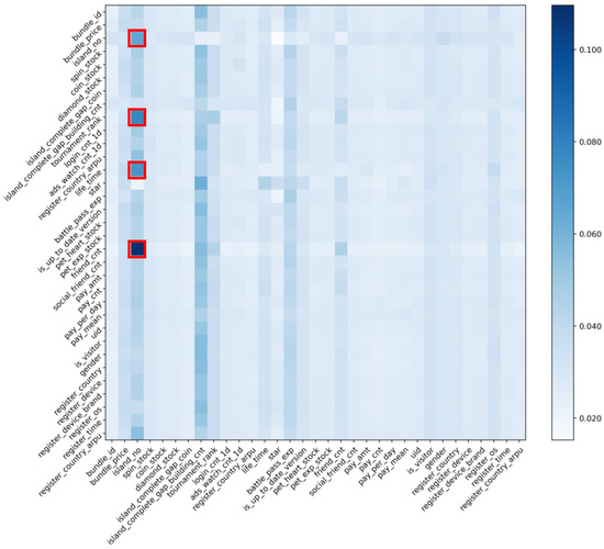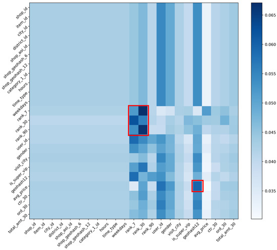 Figure 5 and Figure 6 represent the attention weight matrix in the last AutoInt layer of the input feature interaction layers on both datasets, respectively. The results are the average on the test samples. For the dataset Ele.me, we find that the interacting layer can learn meaningful feature combinations, such as , and (i.e., the red rectangle). It is reasonable that the item rank of the recent 7 days , the item rank of the recent 30 days , and the item rank of the recent 90 days are correlated with each other. A user’s average purchase price is also related to the user’s geolocation . Likewise, for the dataset Bundle, the input feature interaction layers can also learn the relations between different user state features, such as , , and (i.e., the red rectangle). They are explainable rules in the online game setting because a higher rank of the user’s current island level indicates a higher rank in the tournament, a longer duration of the user using the game application, and a higher number of friends in the game platform.