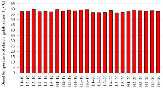 The onset temperature of starch gelatinization for the studied rye flour samples; the sample codes refer to the flour types H (high-extract) and L (low-extract), the numbers from 1 to 6 indicate subsequent batches of flour samples, and the numbers 19 and 20 indicate the year of flour production (2019 and 2020, respectively).