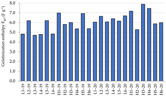 The gelatinization enthalpy was in the range of 4.7 to 7.9 J·g−1 (Table 3, Figure 2). The low-extract rye flour samples were characterized by significantly lower gelatinization enthalpy compared to the high-extract rye flour (on average, 5.8 and 6.4 J·g−1, respectively). Additionally, the flour samples produced in the 2019 year were characterized by significantly lower gelatinization enthalpy compared to the flour samples produced in the 2020 year (on average, 5.7 and 6.5 J·g−1, respectively). The differences in the gelatinization enthalpy might result from differences in the amylose and amylopectin content [41,43,44], the shape of the starch granules, the share of large and small granules [45] as well as differences in the fat content present in the starch granules [46].