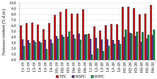 Pentosan content: total (TPC), water soluble (WSPC) and water insoluble (WIPC) in the studied rye flour samples (sample codes as in Figure 1).