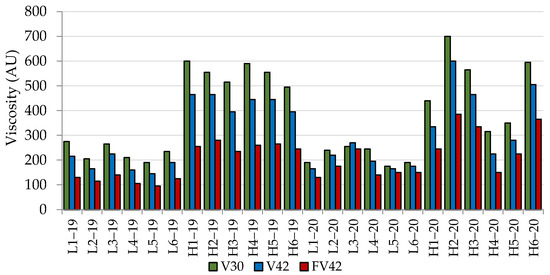 The viscosity of the samples after reaching a temperature of 42 °C (V42) ranged from 145 to 600 AU (Figure 4). The study conducted by Banu [56] revealed that laboratory low-extract rye flour samples were characterized by a viscosity V42 in a narrow range, as in the current study, i.e., 120 to 140 AU. Similar to the viscosity V30, low-extract rye flour was characterized by a significantly lower value of the V42 compared to high-extract rye flour (average value of 191 and 435 AU, respectively). Statistical analysis did not show a significant impact of the year of flour production on the values of the V30 and V42. Suspensions from the tested rye flour samples produced in 2019 and 2020 were characterized by similar levels of V30 and V42 (average V30: 391 and 372 AU as well as V42: 309 and 317 AU, respectively).