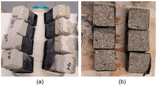 In accordance with the testing procedure suggested by “UNI EN 1015-11:2019. Methods of test for mortar for masonry; Determination of flexural and compressive strength of hardened mortar”, compression loads were applied on the two halves of the specimens previously broken by bending 28 days after casting. The load was applied to a loading area of 40 mm × 40 mm in each half. Following the European “Standard UNI EN 196-1:2016 [15]. Methods of testing cement—Part 1: Determination of strength”, the load increase was set to 2400 N/s until failure. The frame adopted for the test, connected to the testing machine, model Advantest9, provided by Controls S.p.A., had a maximum load of 250 kN.