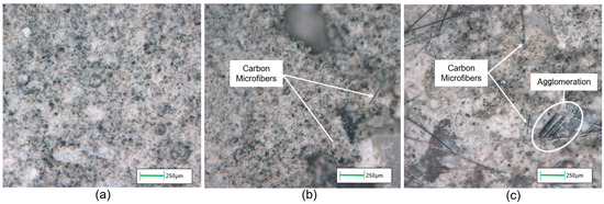 Before presenting the results of tests on materials and samples at fresh and hardened states, a preliminary internal structure analysis is discussed. Micrographs were obtained by Nikon Epiphot 300 inverted microscope and a Nikon digital camera (Figure 6). Figure 6a represents the internal appearance of the base mortar characterized by cement and sand, while Figure 6b,c show the magnifications of cement mortars doped with 0.05% and 0.5% of carbon microfibers, respectively. The investigation reveals that the distribution of the fibers is quite homogeneous up to a 0.05% fiber content, while for higher amounts of microfibers agglomerations start to appear, causing discontinuity and weak zones in the local material and impairing its mechanical performance, as demonstrated by results of mechanical tests, described in the next sections.