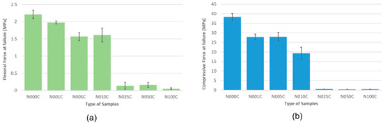 Experimental mechanical results. Average maximum forces obtained from (a) flexural and (b) compressive tests (error bars represent plus/minus the standard deviation σ).