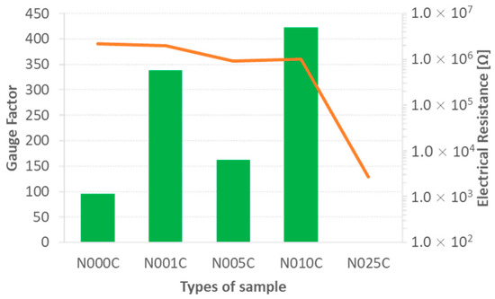 Electrical resistance (solid line) and Gauge Factors (columns) of the samples tested at compressive loading.