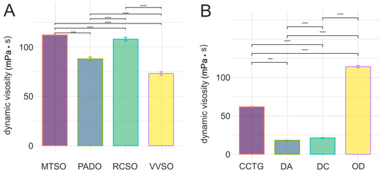 Dynamic viscosity of cosmetic emollients. (A)—natural emollients; (B)—synthetic/semisynthetic emollients; Natural emollients: MTSO—Macadamia Ternifolia Seed Oil, PADO—Prunus Amygdalus Dulcis (Sweet Almond) Oil, RCSO—Ricinus Communis (Castor) Seed Oil, VVSO—Vitis Vinifera (Grape) Seed Oil. Synthetic/semisynthetic emollients: CCTG—Caprylic/Capric Triglyceride, DA—Dibutyl Adipate, OD—Octyldodecanol, DC—Dicaprylyl Carbonate; ***—significance level p < 0.001, ****—significance level p < 0.0001.