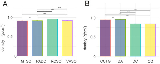 Density of cosmetic emollients. (A)—natural emollients; (B)—synthetic/semisynthetic emollients; Natural emollients: MTSO—Macadamia Ternifolia Seed Oil, PADO—Prunus Amygdalus Dulcis (Sweet Almond) Oil, RCSO—Ricinus Communis (Castor) Seed Oil, VVSO—Vitis Vinifera (Grape) Seed Oil. Synthetic/semisynthetic emollients: CCTG—Caprylic/Capric Triglyceride, DA—Dibutyl Adipate, OD—Octyldodecanol, DC—Dicaprylyl Carbonate; ***—significance level p < 0.001, ****—significance level p < 0.0001.