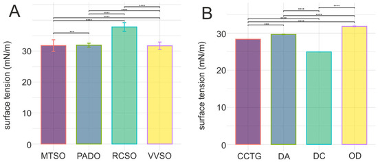 Surface tension of cosmetic emollients. (A)—natural emollients; (B)—synthetic/semisynthetic emollients; Natural emollients: MTSO—Macadamia Ternifolia Seed Oil, PADO—Prunus Amygdalus Dulcis (Sweet Almond) Oil, RCSO—Ricinus Communis (Castor) Seed Oil, VVSO—Vitis Vinifera (Grape) Seed Oil. Synthetic/semisynthetic emollients: CCTG—Caprylic/Capric Triglyceride, DA—Dibutyl Adipate, OD—Octyldodecanol, DC—Dicaprylyl Carbonate; ***—significance level p < 0.001, ****—significance level p < 0.0001.