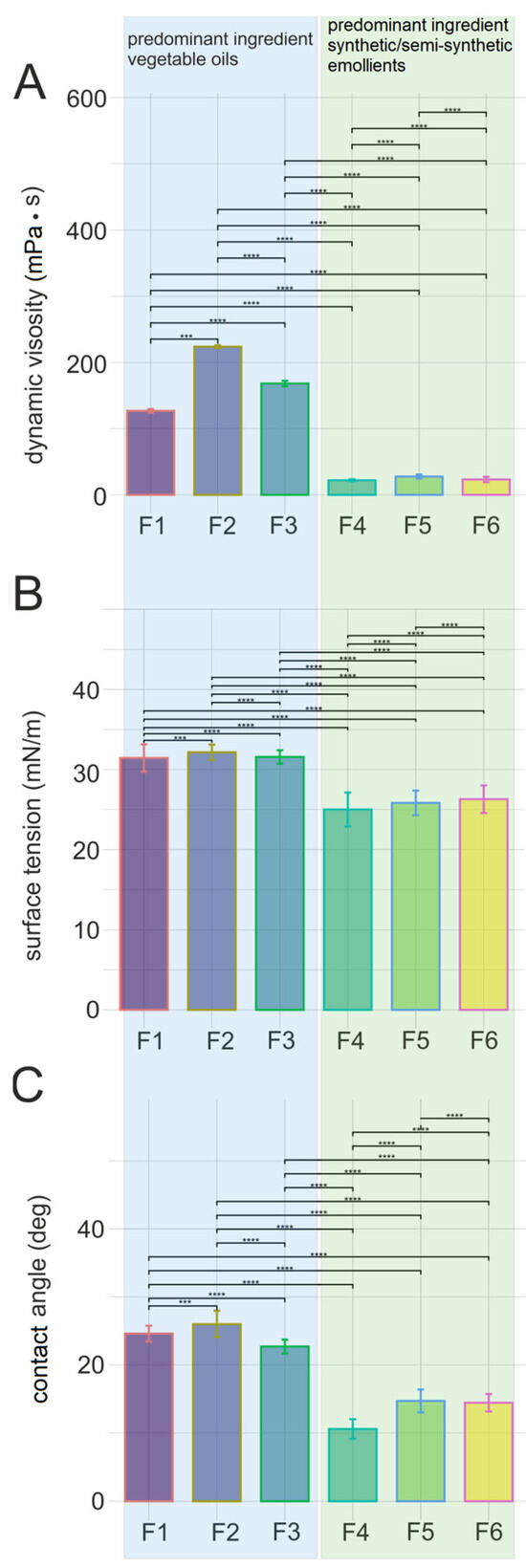 Physicochemical properties of body oils. (A)—dynamic viscosity, (B)—surface tension, (C)—contact angle. F1–F3 and F4–F6 specific recipes. For F1–F3, the predominant ingredient was vegetable oils, whereas for F4–F6, the predominant ingredient was synthetic/semi-synthetic emollients, ***—significance level p < 0.001, ****—significance level p < 0.0001.