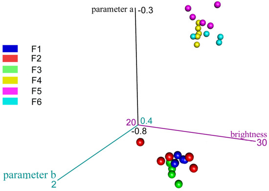 Three-dimensional clustering of colorimetric parameters body oils. F1–F3 and F4–F6 specific recipes. For F1–F3, the predominant ingredient was vegetable oils, whereas for F4–F6, the predominant ingredient was synthetic emollients.