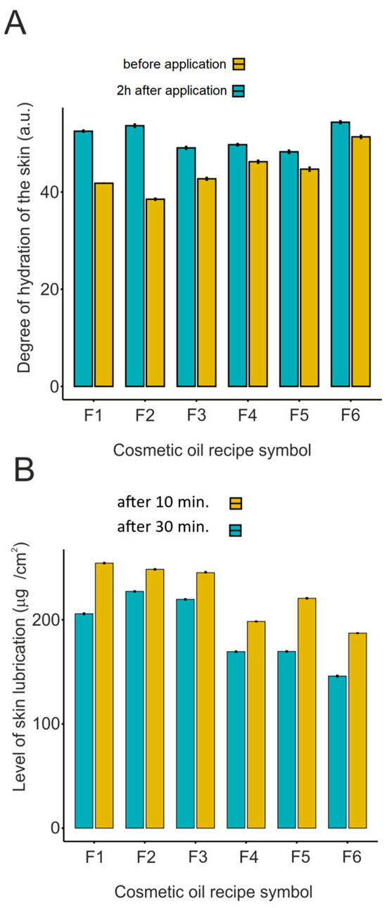 Diagnosing the condition of the skin before and after the application of body oils. (A): degree of skin hydration; (B)—level of skin lubrication. F1–F3 and F4–F6 specific recipes. For F1–F3, the predominant ingredient was vegetable oils, whereas for F4–F6, the predominant ingredient was synthetic emollients.