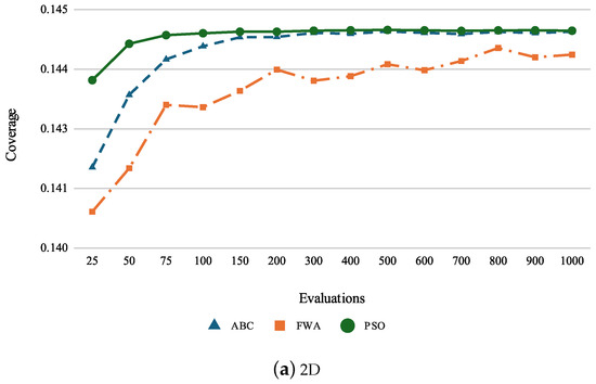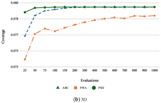Although the statistical analysis showed that 50 evaluations per independent variable achieved a coverage value that was not significantly different from that achieved with more evaluations, the statistically significant interaction between the factors prompted us to perform a post hoc analysis of all factors. This post hoc analysis showed that PSO performs better than ABC only for