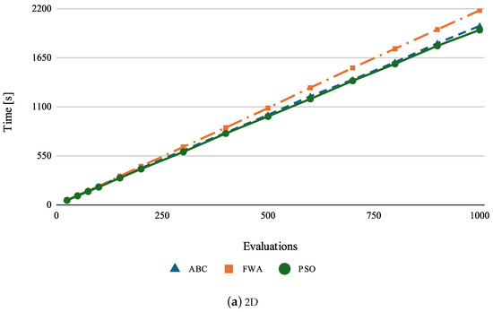 and it overlaps again for ABC and PSO, while it increases somewhat faster for FWA.