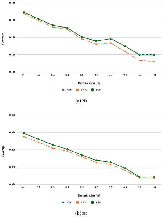 Again, to statistically analyze the effects of the optimization algorithm used and the rasterization value on the average coverage, we performed a two-way RM ANOVA. Namely, a ANOVA was utilized, with Algorithms (three instances) and Rasterization (10 instances, m to m, step m) being the within-subjects factors. The test yielded the following results: