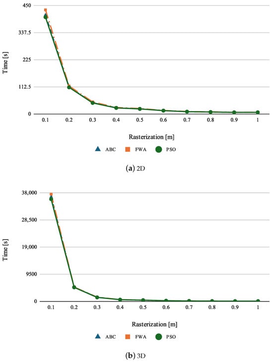 m both ABC and PSO perform better than FWA, with no significant difference between them. For the three-dimensional environment, a post hoc analysis showed that ABC and PSO outperform FWA for all rasterization values. This can be seen in