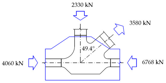 The joint was tested by Xue in the laboratory under the load condition shown in Figure 3. Force cells were positioned at the interfaces between the joint and the different members arriving in the connection. The structure was loaded up to 1.7 times the design loads, the forces were applied by hydraulic jacks using 17 steps with a load step increment of 10%. Each load step took 5 min and the load was maintained constantly for 10 min before proceeding with the next step. The maximum loads reached during the laboratory test are pictured in Figure 3.