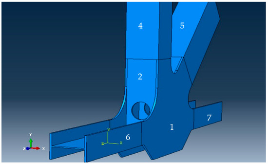 Static nonlinear analyses were performed on the model and the results were compared with the results of the laboratory tests performed by Xue et al. [13]. The numerical strains and stresses obtained by the model have been compared to the target points where information was available from the laboratory sample, hence in coincidence with the gauges’ positions shown in Figure 7. Such correspondence is highlighted in Figure 8.