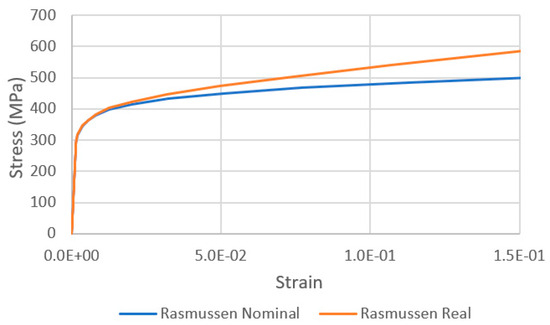 - Rasmussen, K.J. Full-range stress–strain curves for stainless steel alloys. J. Constr. Steel Res. 2003, 59, 47–61. [Google Scholar]