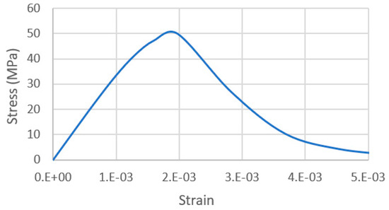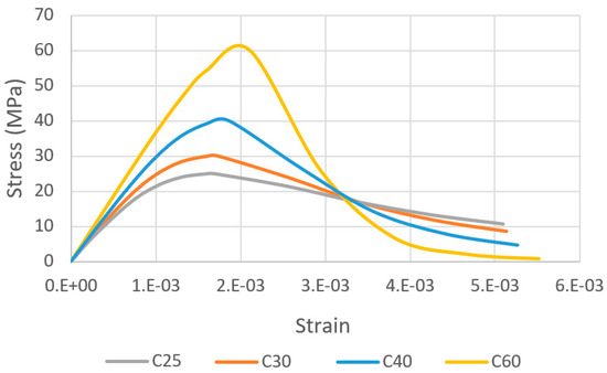 The resulting compressive and tensile stress–strain curves, for each of the four types of concrete investigated in this study, are depicted in Figure 9 and Figure 10, respectively.