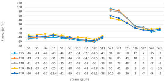 It can be appreciated that when the grade of concrete decreases, the strain gauges installed on the surface of the steel show an increase in the amount of tension on the surface of the steel and also increase the pressure on the level of the horizontal strain gauges appointed in the main beam. Moreover, as expected, an opposite trend can be observed for the model with concrete grade equal to C60. Also, as the grade of concrete decreases, the strain gauges installed on the concrete rebars show the reduction of the recorded compressive stresses and the increase of the recorded tensile stresses. Nevertheless, the structural response of the model seems to be only slightly affected globally by the concrete grade. Negligible discrepancies in compressive and tension behavior are recognized.