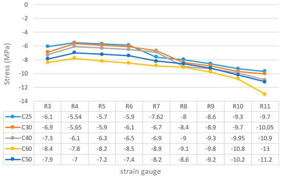 Figure 11 and Figure 12 illustrate the evolution of the stress according to the reference points selected for both steel and concrete, respectively, while changing the concrete grade.