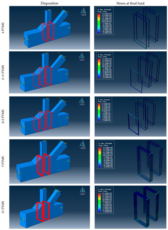 The behavior of the belts (PTMSs) becomes clear through the investigation of the distribution of stresses in the areas reinforced with the belts, particularly when examining different belt arrangements. For instance, when two belts are examined together, it can be observed that the sections where the belts are joined undergoes significantly reduced tensile stresses compared to other regions.