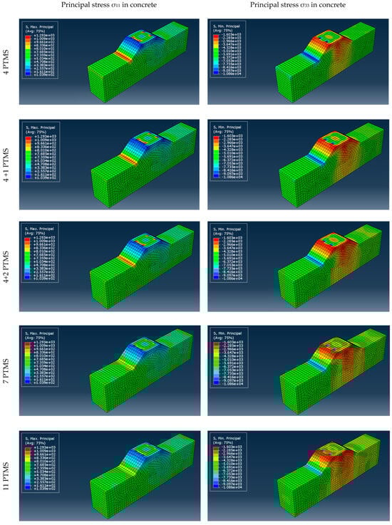 The principal stresses in concrete under the different belt arrangements are presented in Figure 14.