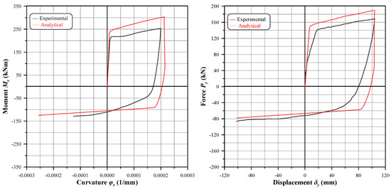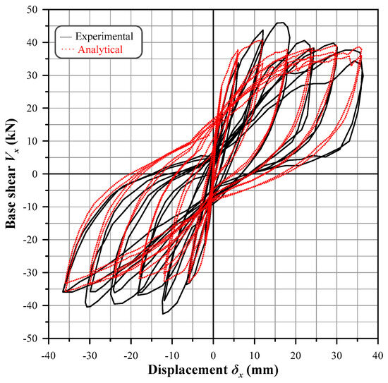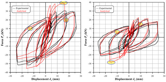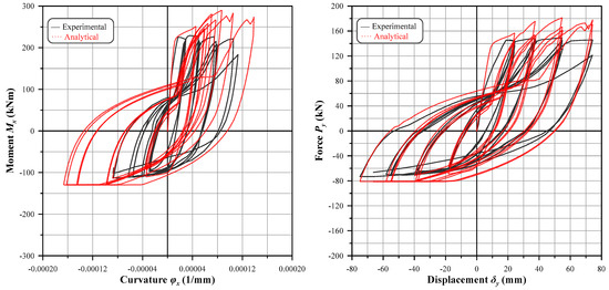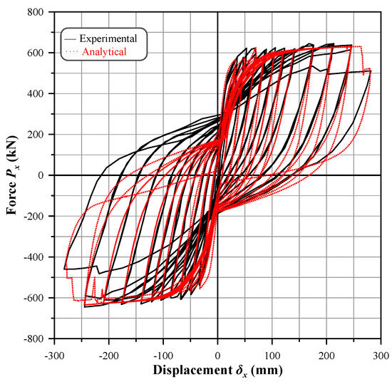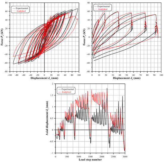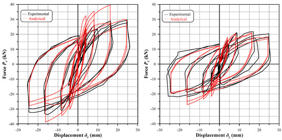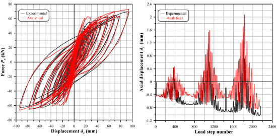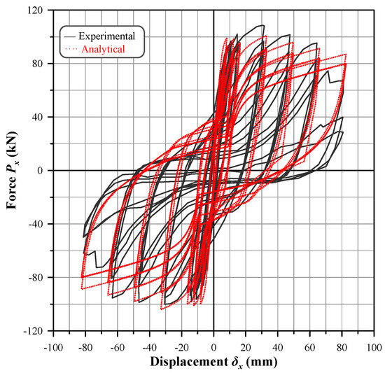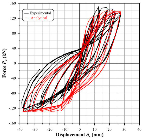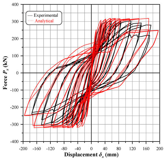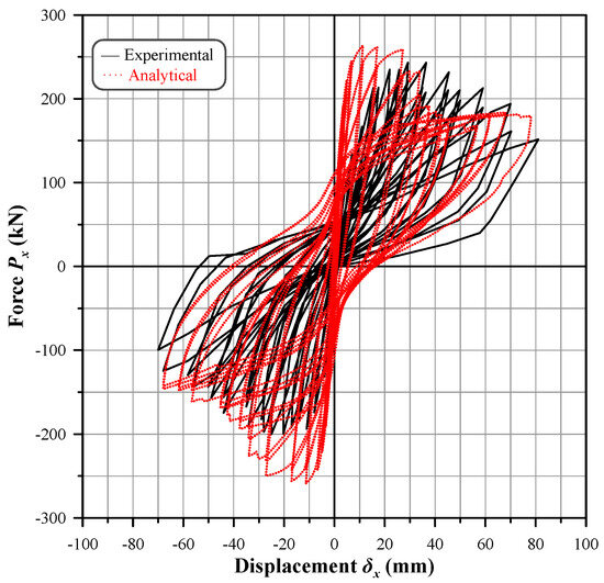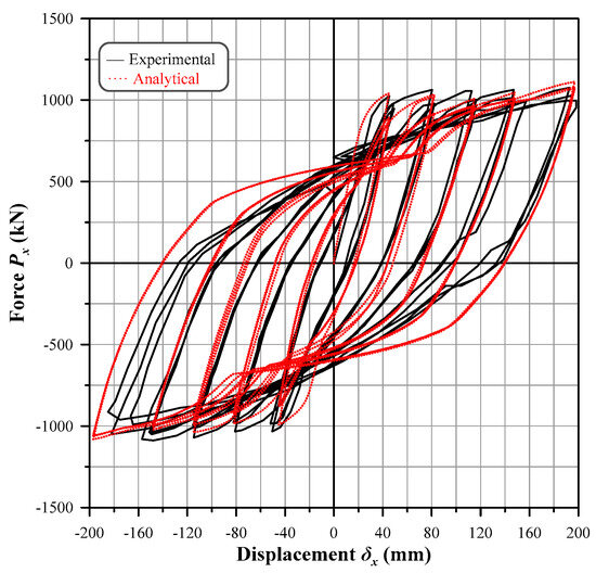 Figure 36 shows the force-displacement response Px-δx. A very good agreement between the analytical and the experimental response is noticed regarding the envelope curves of the hysteretic loops. As occurs with the corresponding specimen S1 of Pham and Li [15], the influence of the pinching effect is not captured quite efficiently by the present form of the proposed model.