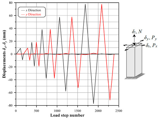 Bousias [3]—Specimen S2. Displacement loading histories δx, δy vs. load step number.