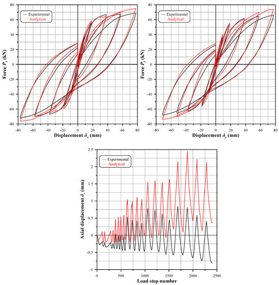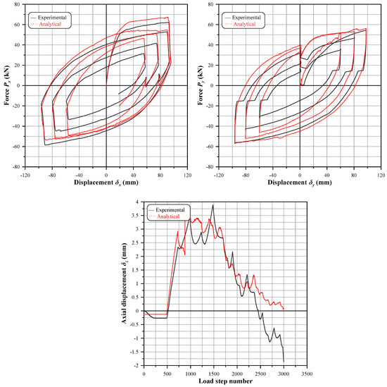 The first two plots of Figure 5 show the force-displacement response separately for each direction (x and y). An almost excellent agreement is noticed between the experimental and analytical results. The third plot shows the evolution of the axial displacement δz in a direction normal to the cross-section plane vs the loading step number.