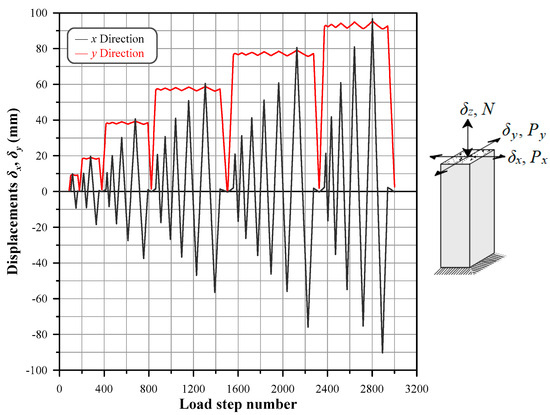 Bousias [3]—Specimen S1. Displacement loading histories δx, δy vs. load step number.