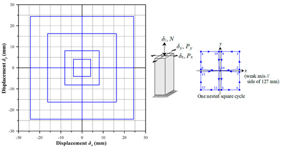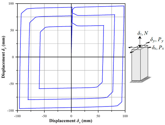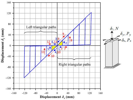 Specimen S1 was subjected to biaxial cyclic loading with the two transverse horizontal loading paths shown in Figure 4, applied in directions x and y, respectively. The displacement cycles in directions x and y are applied alternately. During a step period of nonzero displacements of one cycle, the other’s cycle displacements are zero. Displacement values of each cycle are progressively increased.