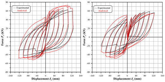 Figure 14 shows the force-displacement responses Px-δx and Py-δy. A very good to excellent agreement is noticed between the experimental and analytical results. Some small overestimation of the force load is noticed in the backbone curve of the first three cycles of the response of x direction; the agreement is almost excellent in the remaining cycles.