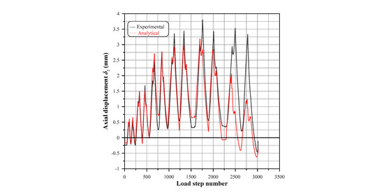 It must be noted that the δz axial displacement is of less practical importance in comparison with the transverse displacement δx. It is presented in the present research work since it is available from experimental data, focusing on the ability of the model to predict even those detailed deformations.