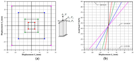 The four colored dots of each square path of Figure 15a denote the linear variation of the axial load, which holds for this path, and is presented graphically with the same color in Figure 15b.